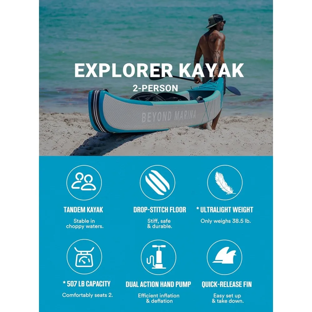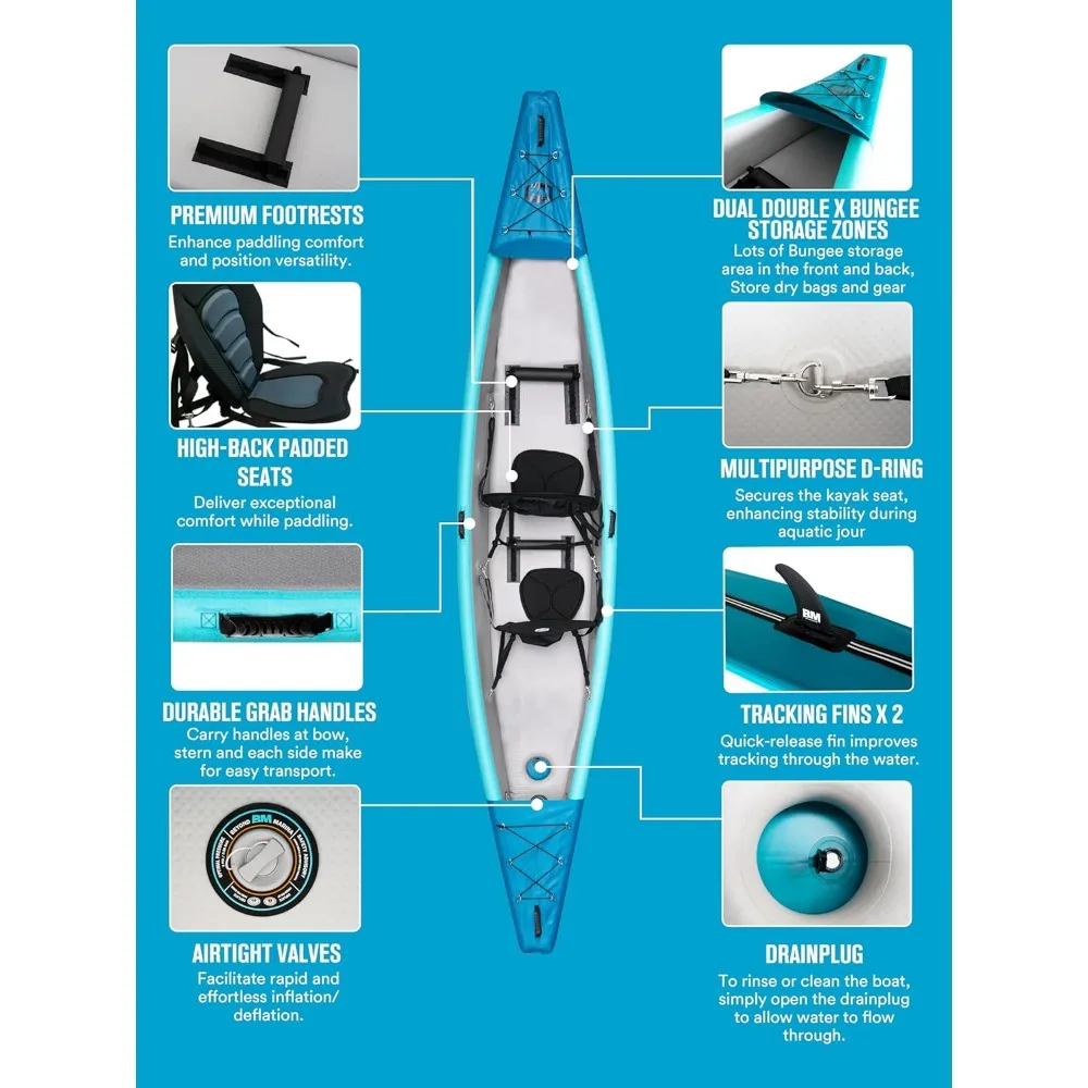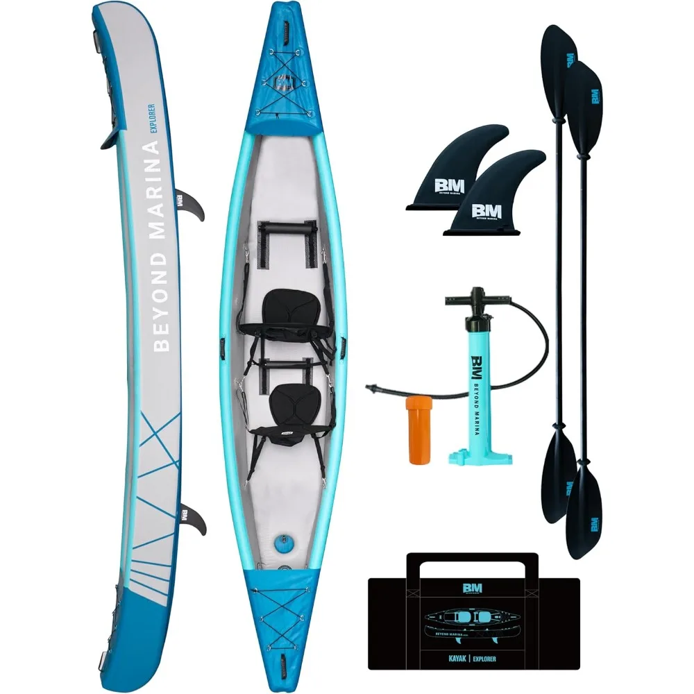 Inflatable Kayak 2 Person Adult- Drop Stitch Tandem Kayak | with Aluminum Paddles, Seats, Footrests, Pump, Fins
