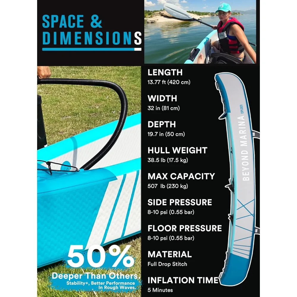 STABILITY & STURDINESS: The EXPLORER 13.77 FT kayak is constructed with a drop-stitch bottom and drop-stitch side chambers, providing enhanced stability and an extremely sturdy design. The high-pressure drop stitch material ensures ultimate balance and makes it more rigid than normal inflatable kayaks. Moreover, the lightweight design (only 38.5 lb) ensures you can easily carry and maneuver the kayak.
