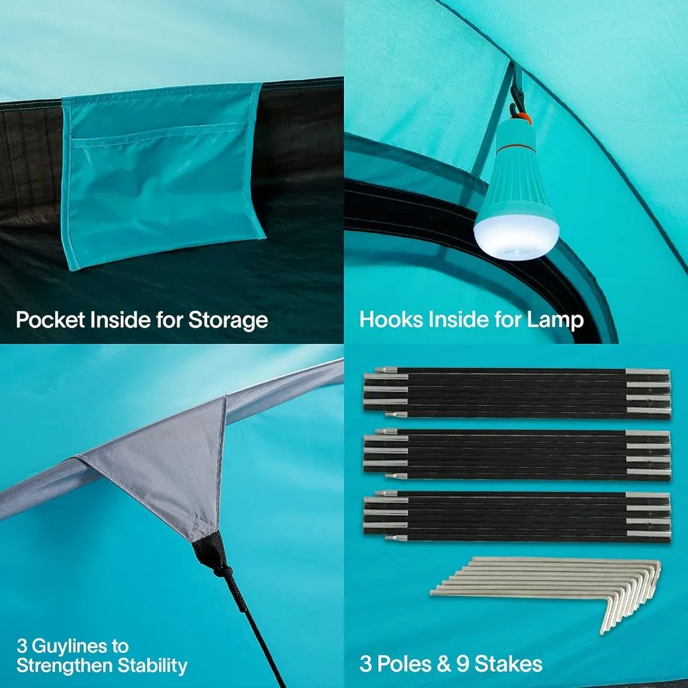 Easy set up & take down, no tools required. Even inexperienced campers can do it instantly. Rolls up easily into a portable carrying bag. Pop-up design eliminates struggles. 3 cross-wound poles for extra strength. Enjoy hassle-free camping with our user-friendly tent.