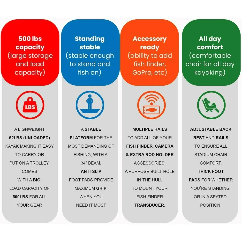 EASY TO CARRY: This professional pedal drive kayak weighs only 68lbs (unloaded) making it easy to lift onto your roof or tailgate and be at your secret fishing spot in no time. It has an incredible 500lbs load capacity, to take you and all your essential gear no matter what’s biting.